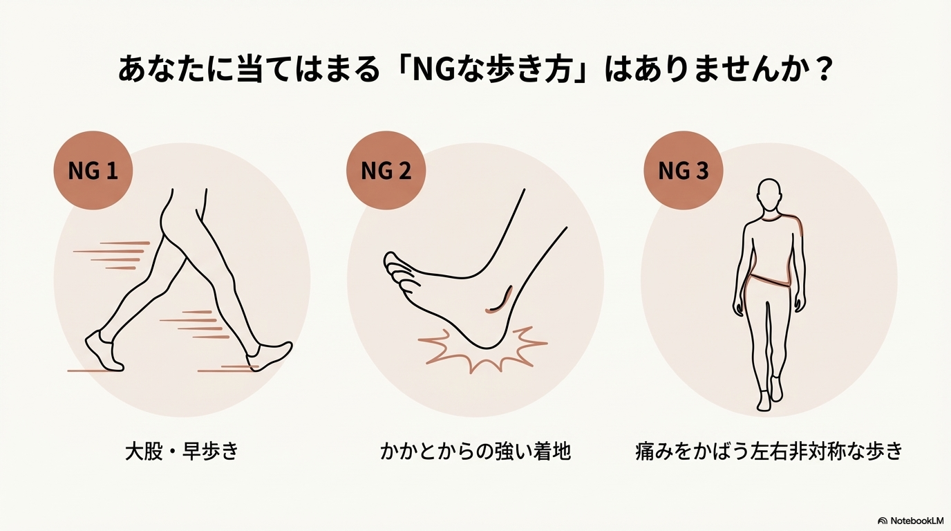 特にすべり症の場合、反り腰が強い歩き方・片側に体重が偏る歩き方・ドスドスと着地衝撃が強い歩き方は、腰椎への負担が増えやすい傾向があります。