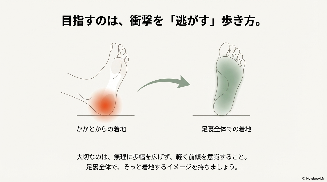かかとから強く着地する歩き方や、音が大きくなる歩き方は、衝撃が腰まで伝わりやすくなります。