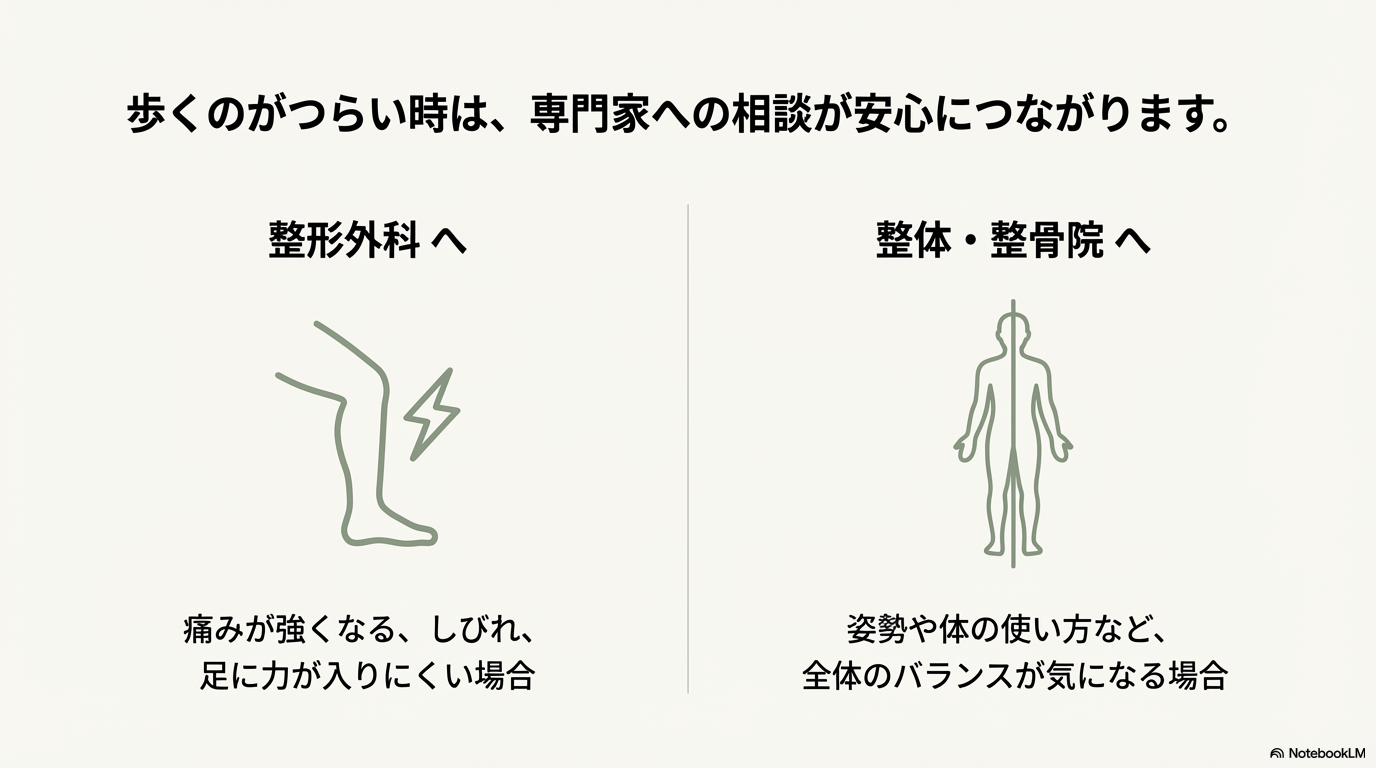 姿勢や体の使い方が影響しているケースでは、整体や整骨院で全身バランスを確認してもらう選択もあるようです。