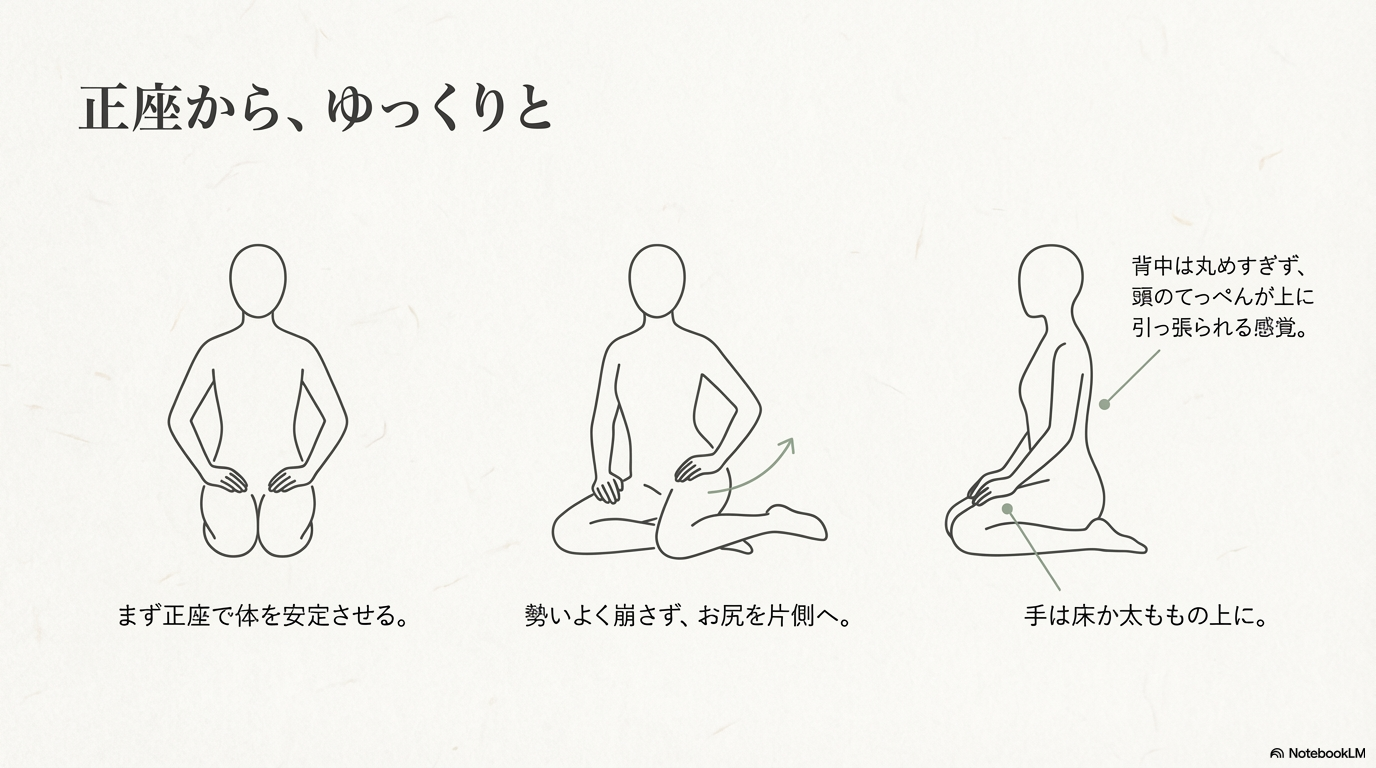 ポイントは、いきなり横に倒れ込まないこと。正座から一度体を安定させ、「ゆっくり脚を横へ」という意識が大切だと考えられています。