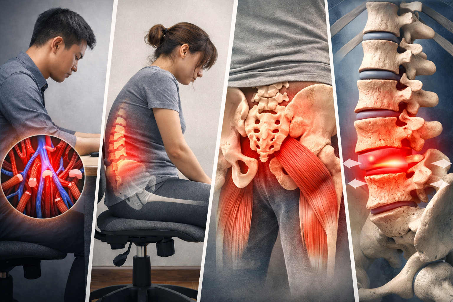 座っている姿勢は一見ラクそうに見えますが、腰には意外と大きな負担がかかっている状態です。筋肉の硬さや姿勢の崩れ、さらには椎間板への圧力など、いくつかの要因が重なって痛みにつながるケースが多いとされています。