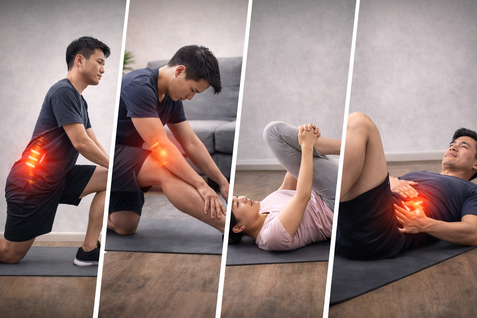 これらの筋肉が硬くなると股関節の動きが制限され、体を動かす際に腰が無理に働く“代償動作”が起こります。その結果、腰への負担が増え、痛みにつながるケースが多く見られます。