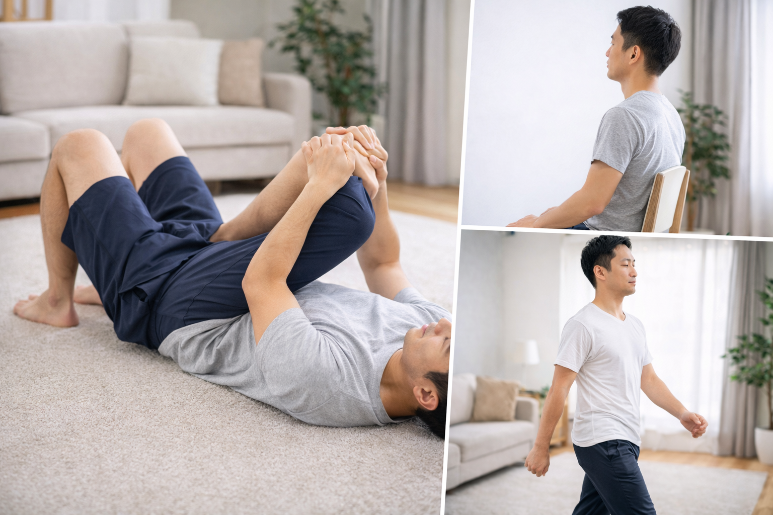 代表的なのは、膝を胸に引き寄せるストレッチです。ゆっくり呼吸をしながら行うことで、腰まわりの筋肉がやわらぎやすくなります。また、骨盤を軽く動かす運動も、可動域の改善に役立ちます。