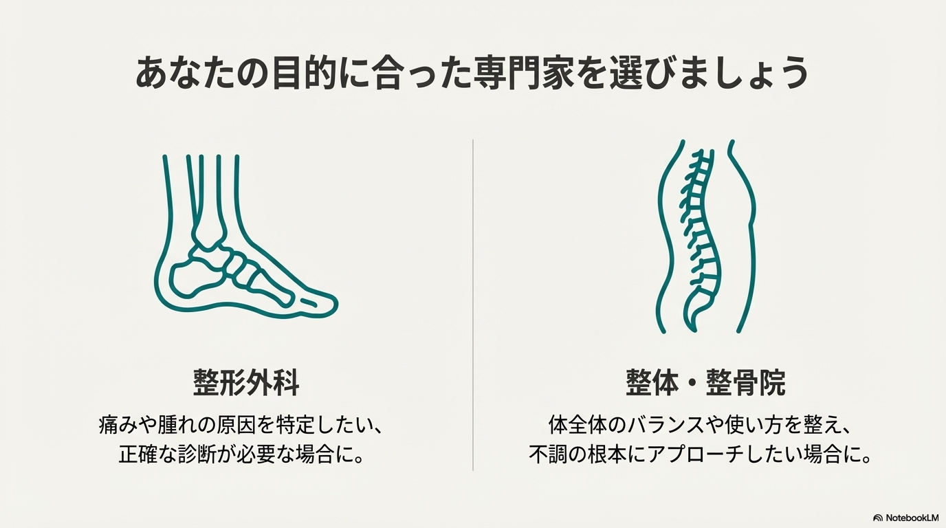 画像診断で「骨には異常なし」と言われたが、硬さや不調が続いている場合に適しています。 整体や整骨院では、足首だけでなく、膝・股関節・骨盤のバランスを含めた全身調整を行います。 特に、ズレてしまった距骨の調整や、癒着した筋膜のリリース(はがし)、テーピングによるサポートなどは、整体院が得意とする分野です。「歩き方」の指導を受けられるのも大きなメリットです。