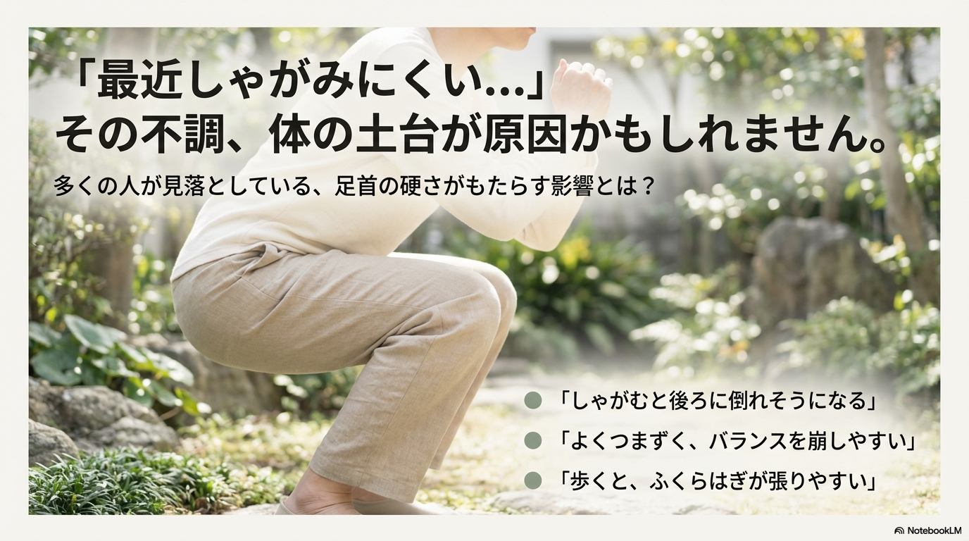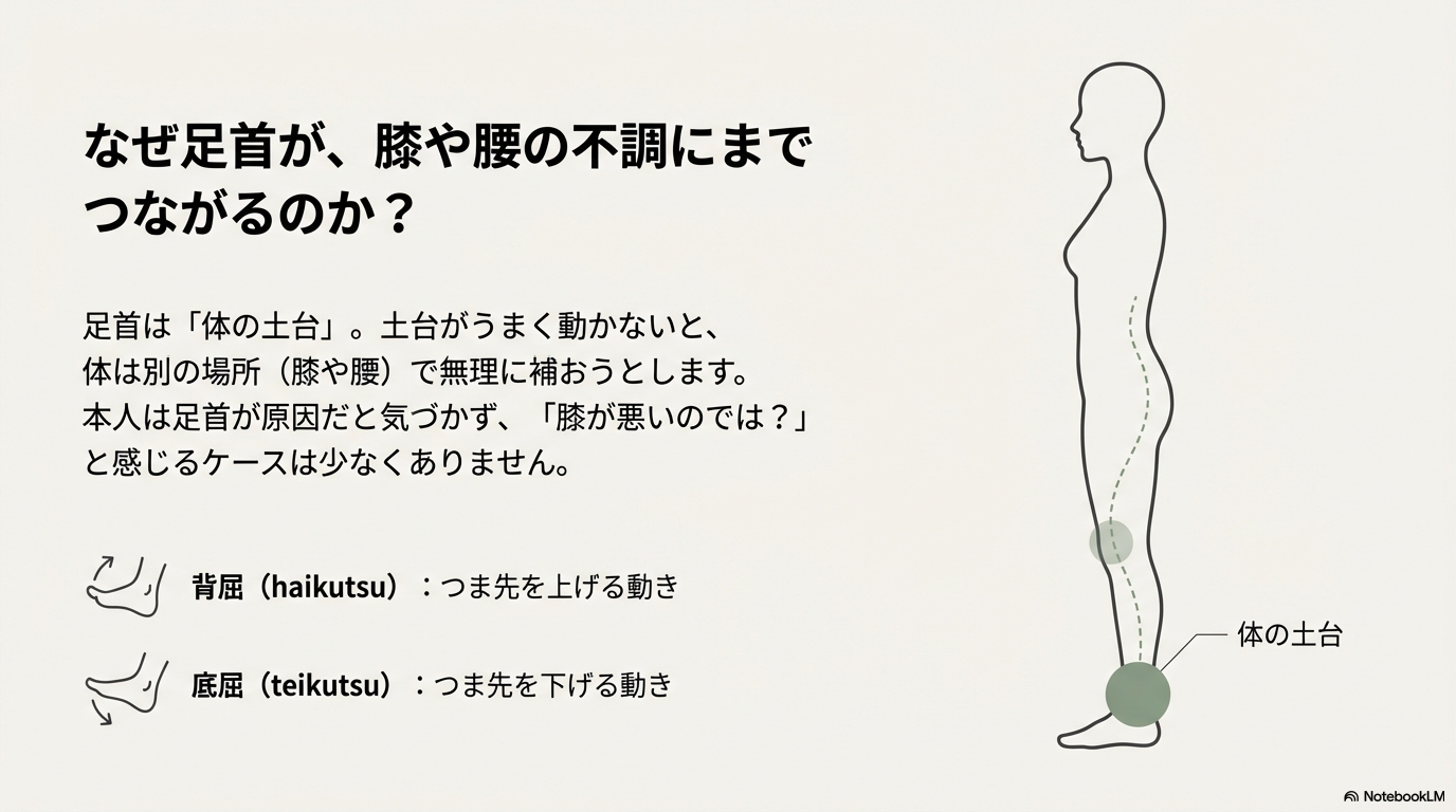 こんな感覚、ありませんか? 実はそれ、足首の硬さが関係しているかもしれないと言われています。足首は毎日の歩く・立つ・座るといった動作の土台になる場所です。ここがうまく動かないと、体は別のところで無理をしやすくなります。