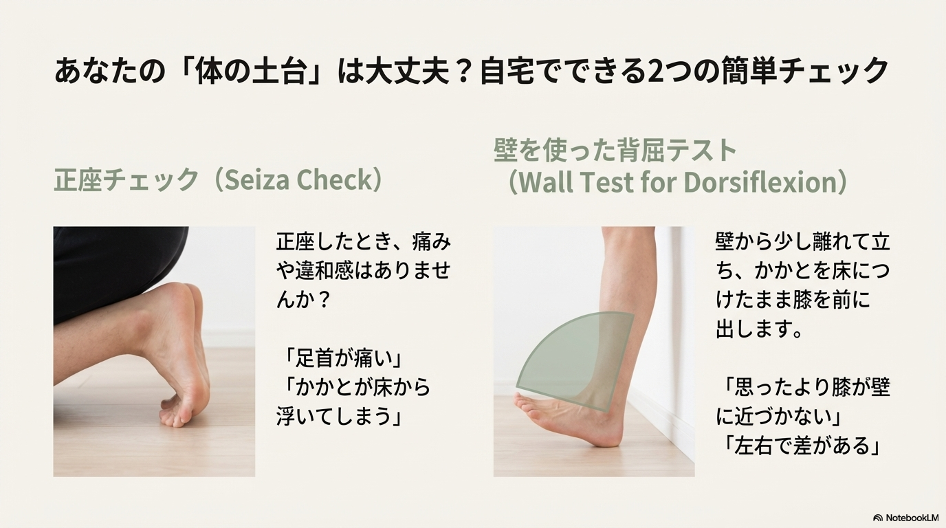 まず試してほしいのが「正座チェック」です。「正座すると足首が痛い」「かかとが床から浮いてしまう」こんな反応が出る場合、足首の背屈が出にくくなっている可能性があると言われています。もちろん、体重や股関節の硬さなど他の要素も関係しますが、「昔は平気だったのに、最近つらいな」と感じるなら、一つのサインとして受け取ってもよさそうです。