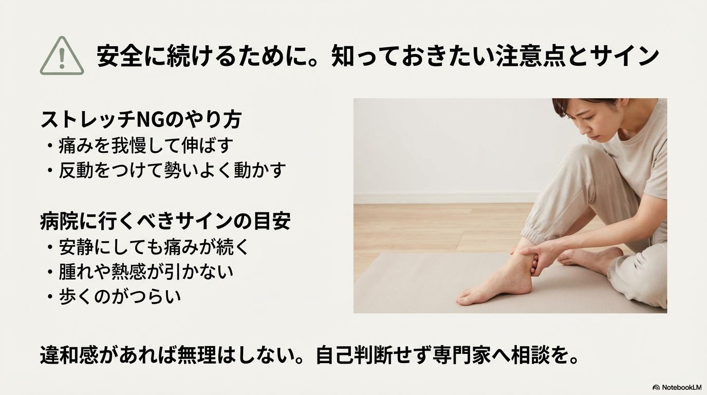 まず気をつけたいのが、「痛いけど我慢して伸ばす」やり方です。「伸びてる感じがしないから、もっと強く…」と力を入れすぎると、筋や関節に余計な負担がかかる可能性があると言われています。また、反動をつけて勢いよく動かすのも注意が必要です。足首は小さな関節のため、ゆっくり・丁寧に動かすことが基本だとされています。違和感が出た場合は、その日は無理をしない判断も大切です。