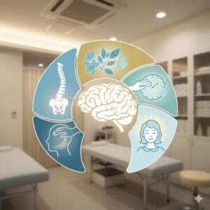 - 整体が頭痛を改善する3つのメカニズム 骨格矯正による筋肉バランスの回復、血流改善による脳への酸素供給、筋膜リリースによる深層筋へのアプローチ