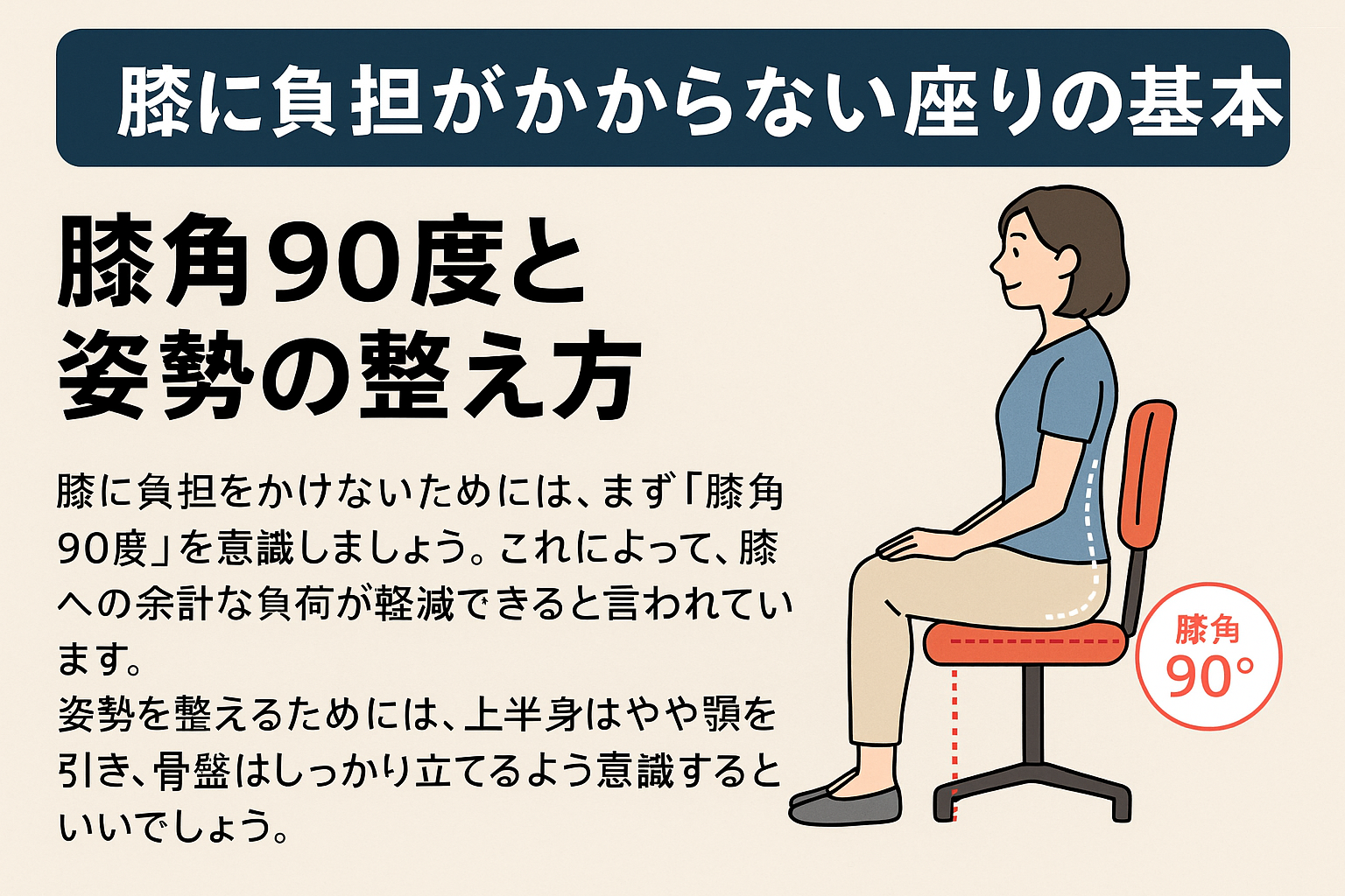 膝角90度を守るだけでなく、骨盤を立てて座ることが股関節や腰の負担軽減にもつながると言われています。背中を丸めたまま座ると体重が一部に集中し、結果的に膝にも余計な負荷が伝わる可能性があると考えられています。