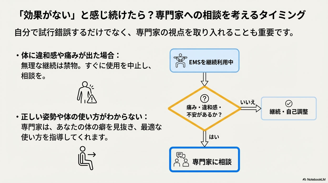 位置がわからない: どこに貼れば一番効くのか、自分の体に合った指導を受けたい場合。 自己流で続けて時間を無駄にする前に、体の専門家に相談し、自分に合ったプログラム(出力、頻度、貼る位置)を組んでもらうことが、結果への近道です。