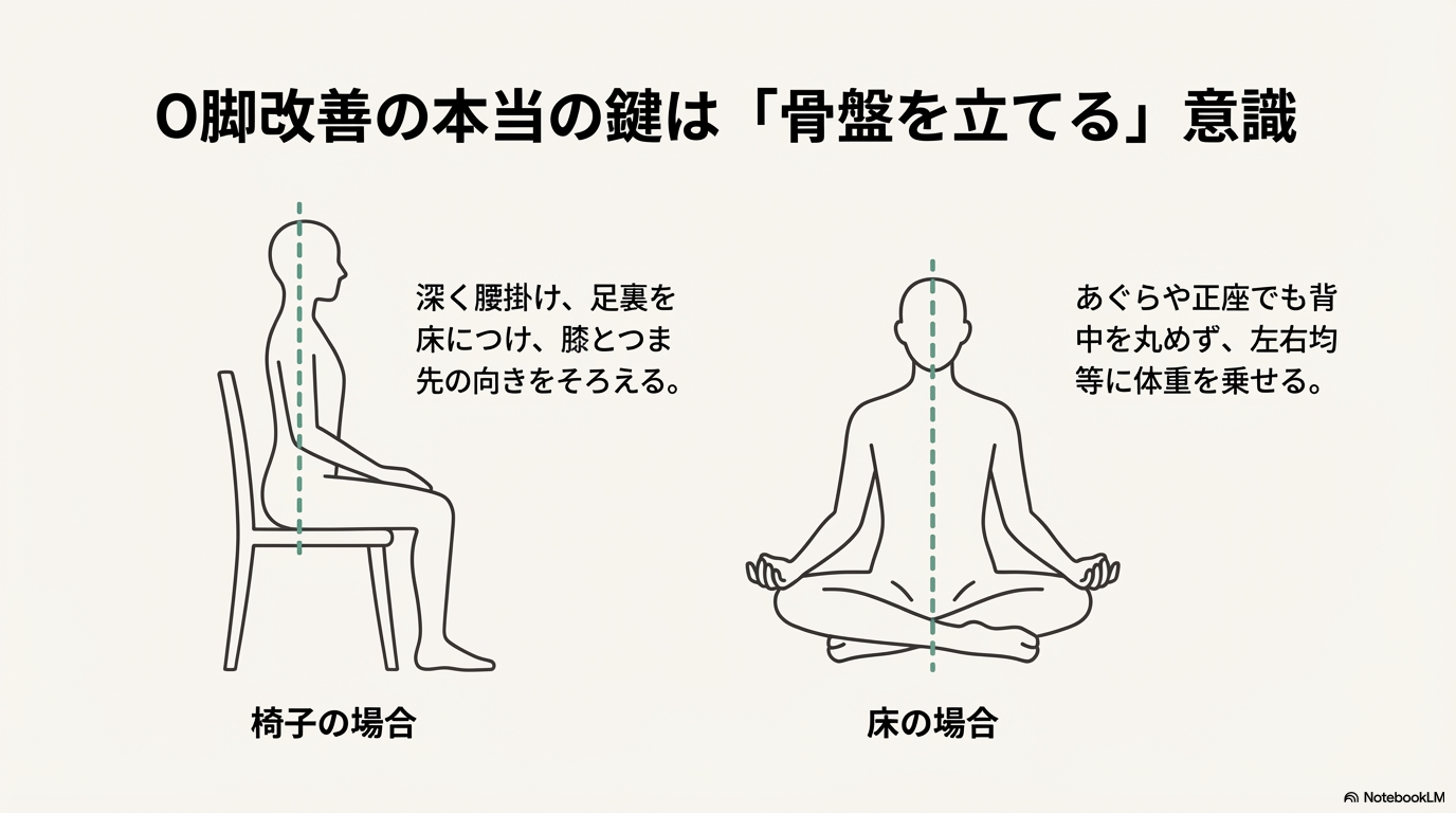 実際には、座り方だけでo脚が改善するとは言い切れないとされています。座り姿勢は生活習慣の一部であり、立ち方や歩き方、体の使い方全体が関係すると考えられています。座り方の見直しは、あくまで一つのきっかけになると言われています。