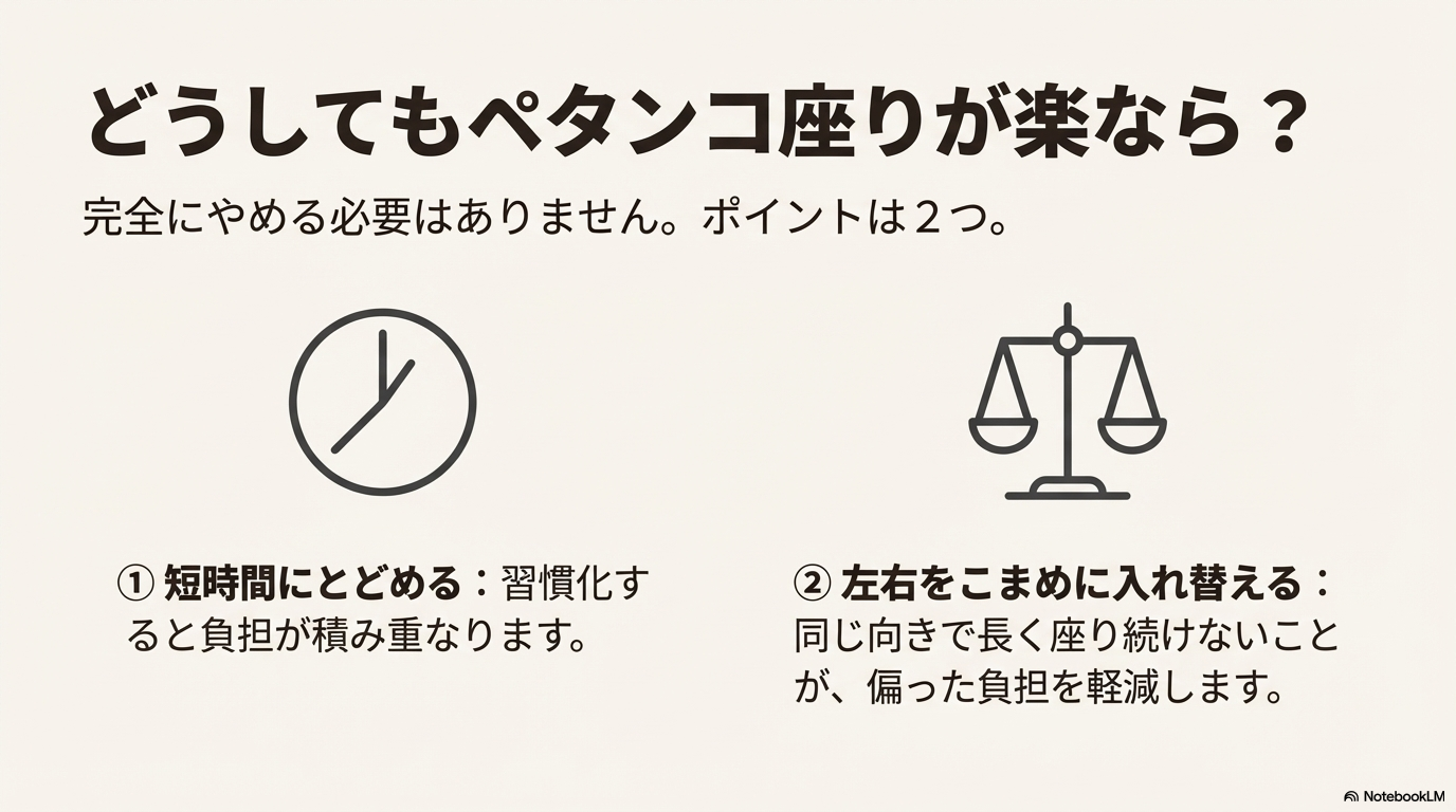 「どうしてもペタンコ座りが楽なんだけど…」という声も多いですよね。その場合は、短時間にとどめることや、左右をこまめに入れ替える工夫がポイントだと言われています。同じ向きで長く座り続けないだけでも、骨盤への偏った負担は軽減しやすいそうです。無理に続けるのではなく、姿勢を切り替える意識が大切だとされています。
