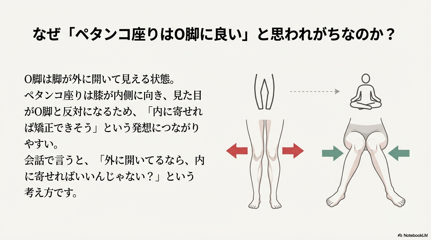 ペタンコ座りでは膝が内側に向きやすく、見た目がo脚と反対になるため、「矯正につながりそう」と感じられやすいと言われています。ただし、長時間続けることで骨盤や股関節に負担がかかる可能性も指摘されています。「良さそうだから続ける」ではなく、仕組みを知ることが大切だと考えられています。