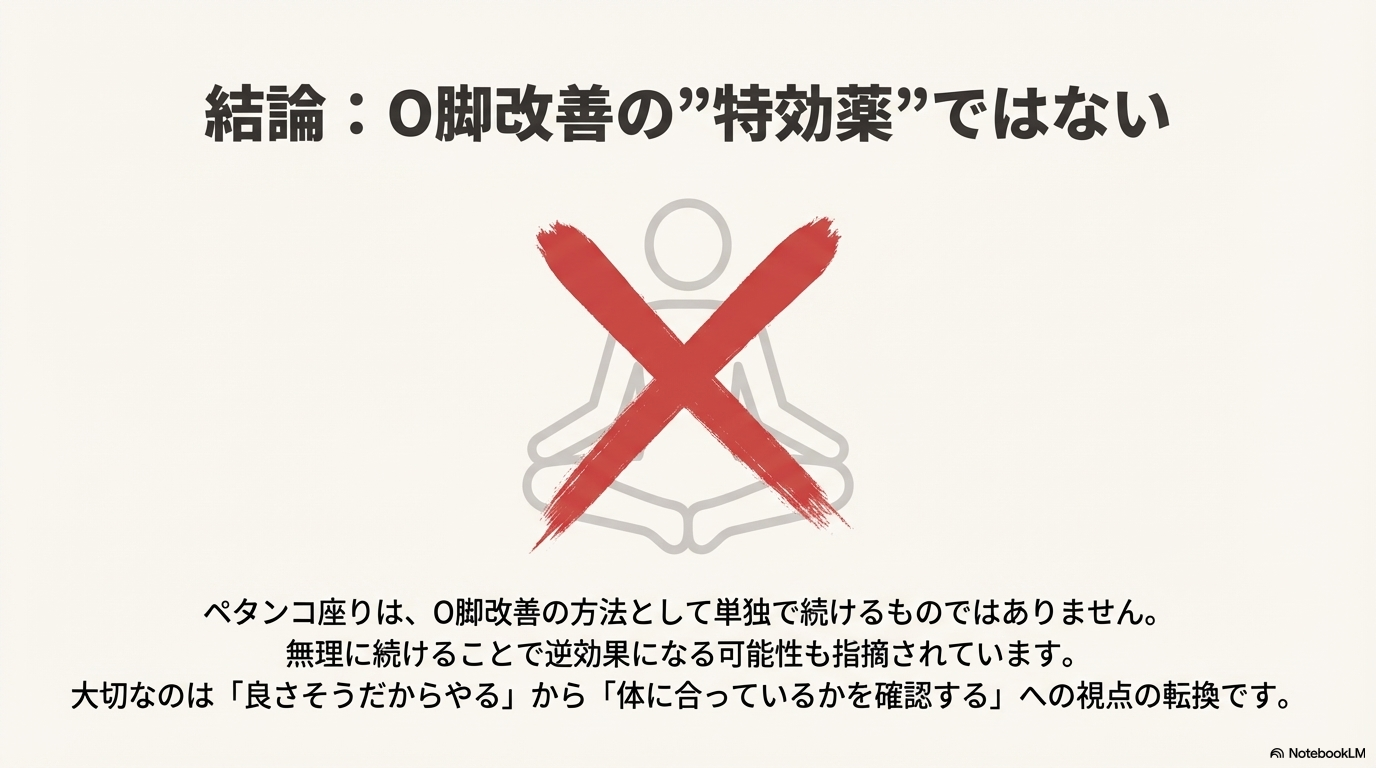 ペタンコ座りは、o脚改善の「方法」として単独で続けるものではないと考えられています。あくまで座り方の一つであり、無理に続けることで逆効果になる可能性もあるそうです。「良さそうだからやる」ではなく、「体に合っているかを確認する」視点が大切だと言われています。