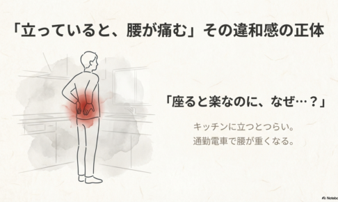立ってると腰が痛いのはなぜ?|まず知っておきたい基本原因 「立ってると腰が痛いんだけど、座ると少し楽になる」 こんな経験、ありませんか?実はこれ、立位特有の体の使われ方が関係していると言われています。 「立位で腰が痛くな…
